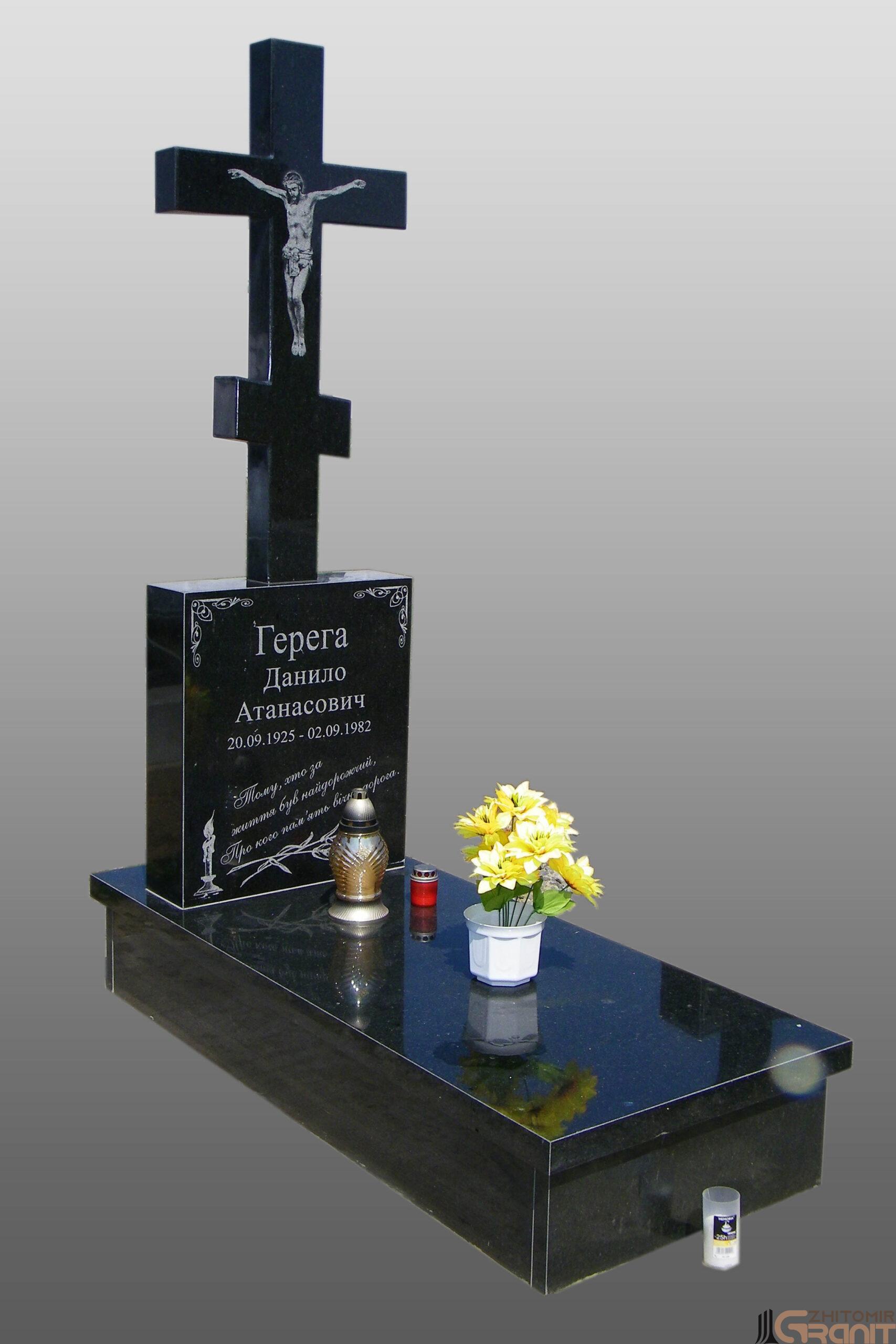 На масивній плиті височіє високий православний хрест із зображенням розп’ятого Христа, що є центральним акцентом композиції. Хрест символізує надію, віру та єдність душі з Богом, нагадуючи про вічний спокій і духовний захист.