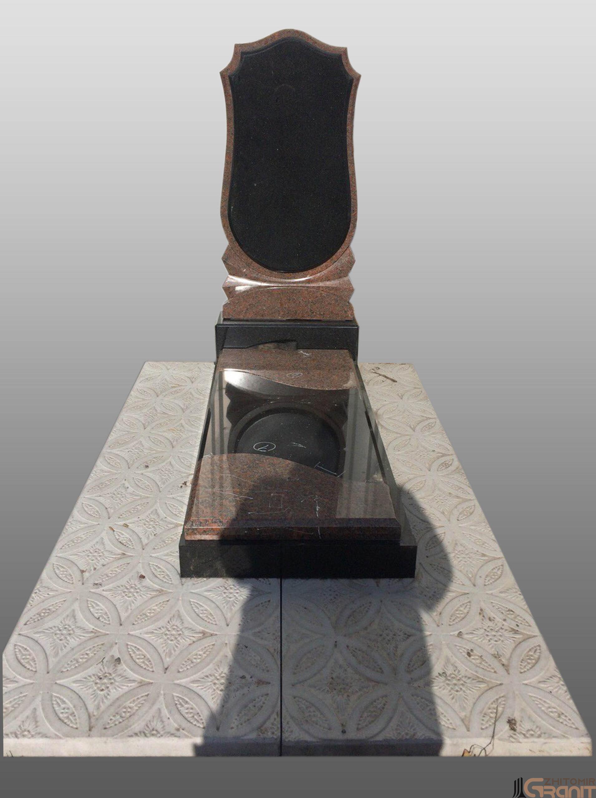 Форма пам’ятника – прямокутник із заокругленим верхом, біля самої основи – хвилеподібна висічена світла смуга. Ефектний контраст чорного гладкого поля пам’ятника і різьбленої витонченої смуги має елегантний вигляд.